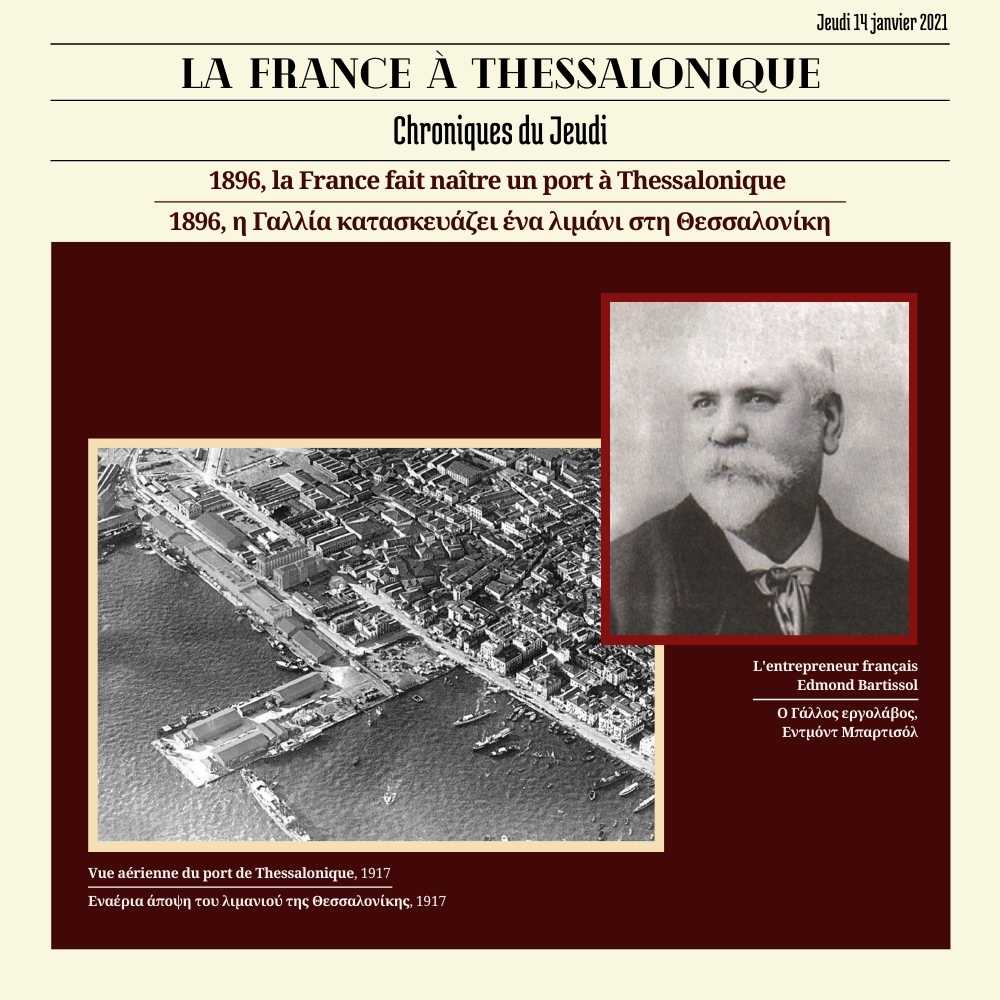 1896, la France fait naître un port à ThessaloniqueC’est à la fin du XIXᵉ siècle, alors que le canal de Suez vient d’être inauguré (en 1869) et que la Méditerranée orientale occupe une place majeure dans le commerce mondial, que Thessalonique tire parti de sa situation géographique et entame son désenclavement : on entreprend la démolition de la portion côtière de ses fortifications, la construction d’importantes infrastructures ferroviaires vers les Balkans et Constantinople, ainsi que la réalisation d’un port artificiel, infrastructure indispensable à son développement économique.
