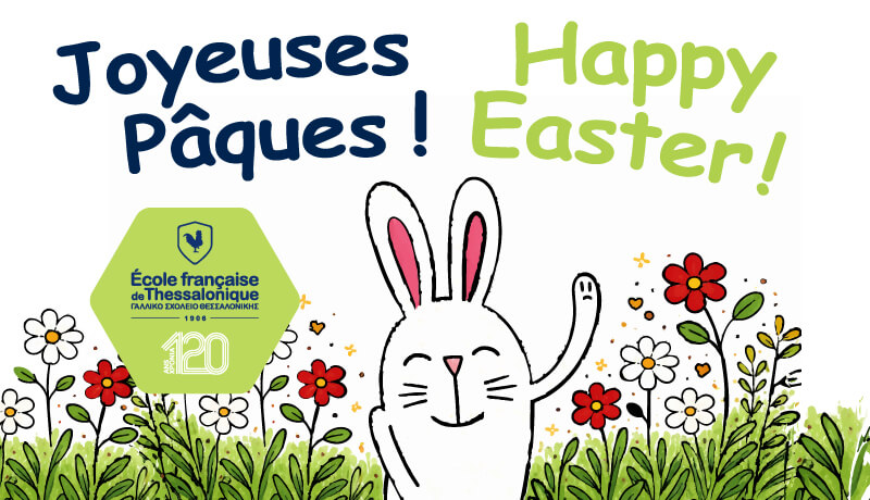 Actualités de l'École Joyeuses Pâques On 03/04/2026 L’Ecole française de Thessalonique est fermée du lundi 6 avril au vendredi 17 avril inclus. Les cours reprendront le lundi 20 avril. Le service administratif reste ouvert de 09h00 à 16h00. Toute l’équipe de l’école vous souhaite de joyeuses fêtes ! Post Views: 54 Share FacebookTwitterGoogle+E-mail